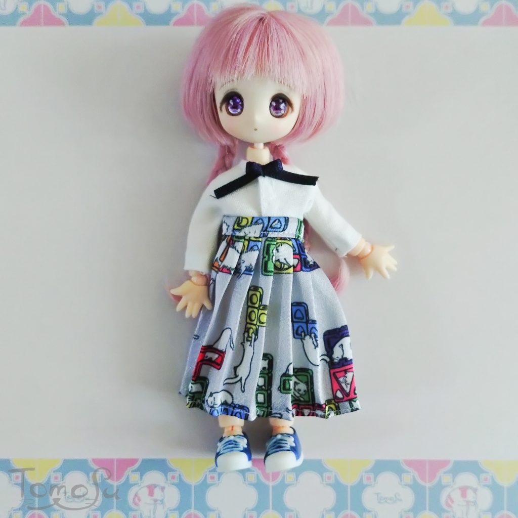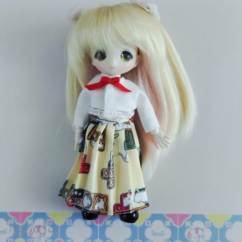 こちらはオビツ11およびピコニーモPサイズのブラウスとスカートのセットです。minneさんにはすでに置いていますがイベントではお初です。セットで1500円。ブラウスにはリボンをつけていますが前後逆に着せて無地にすることもできます(^▽^)/