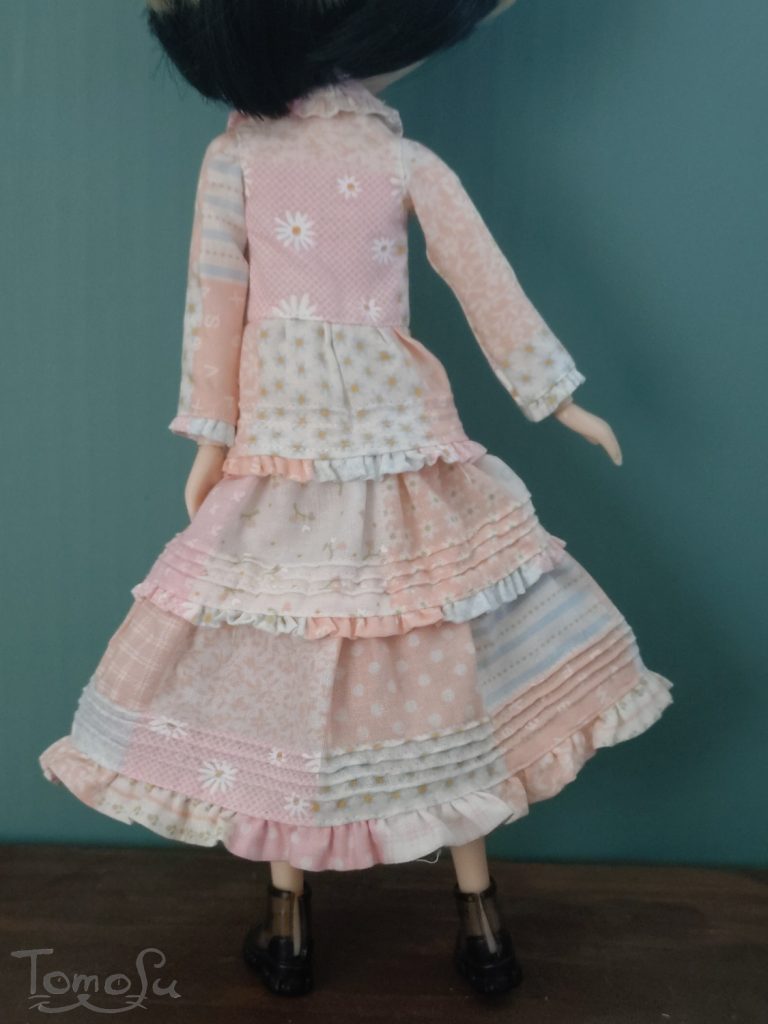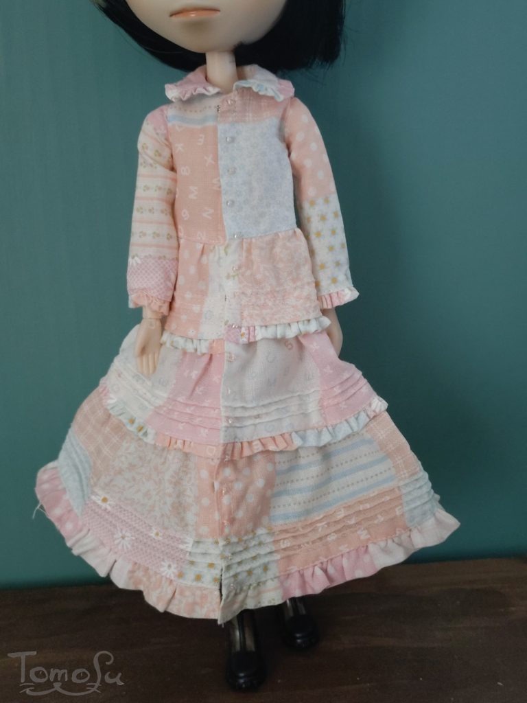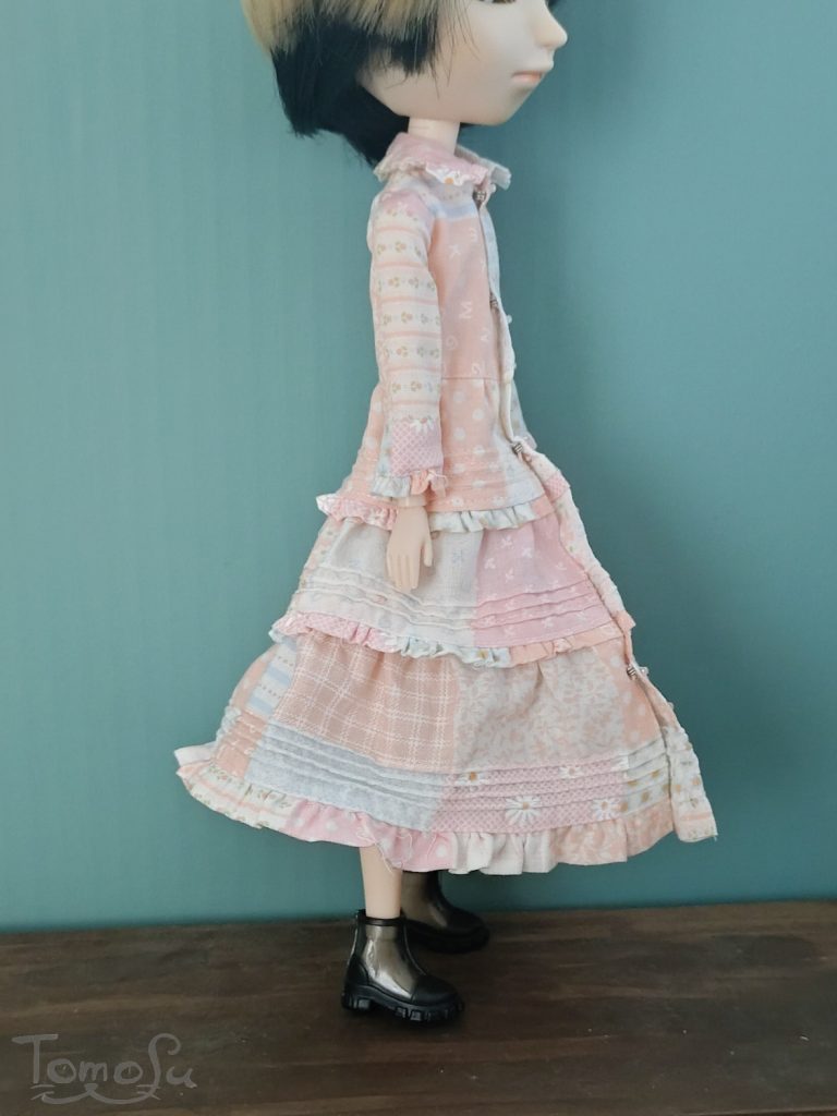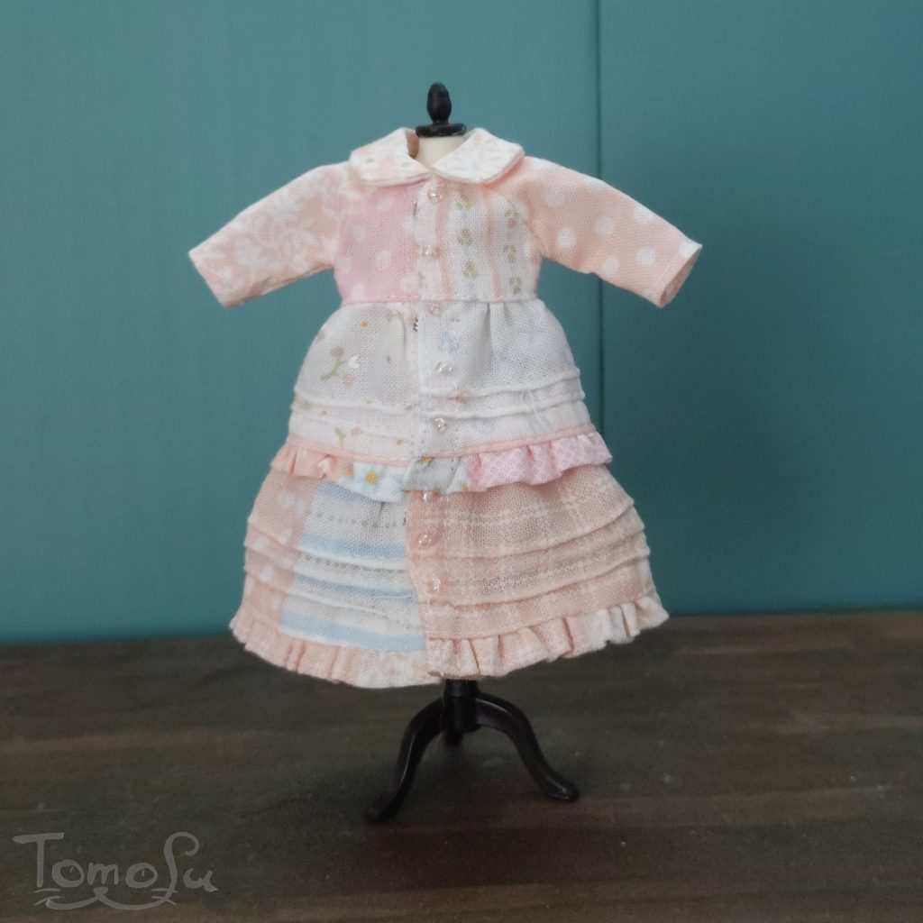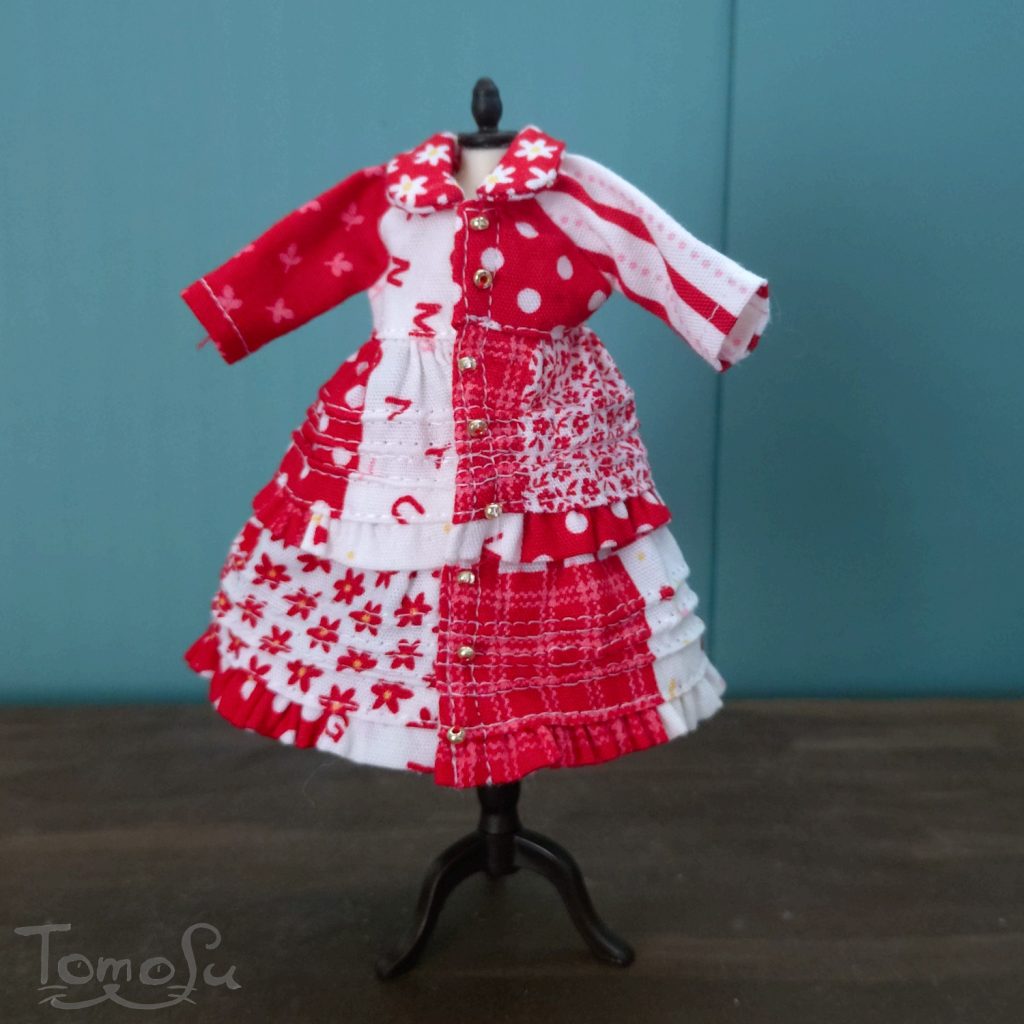 オビツ11くらいのサイズ。こちらはスカートが2段です。こちらは花柄、ピンク系パッチワーク柄、赤系パッチワーク柄の3種類あります。2000円。