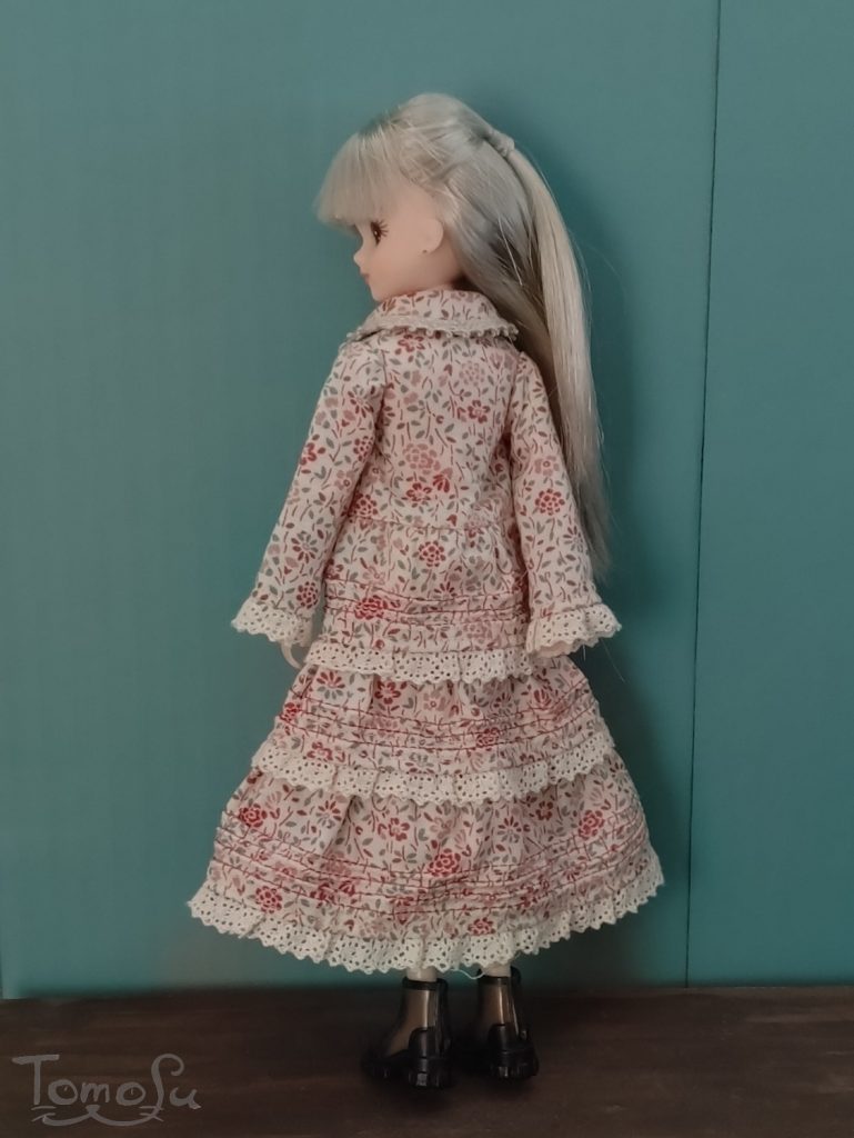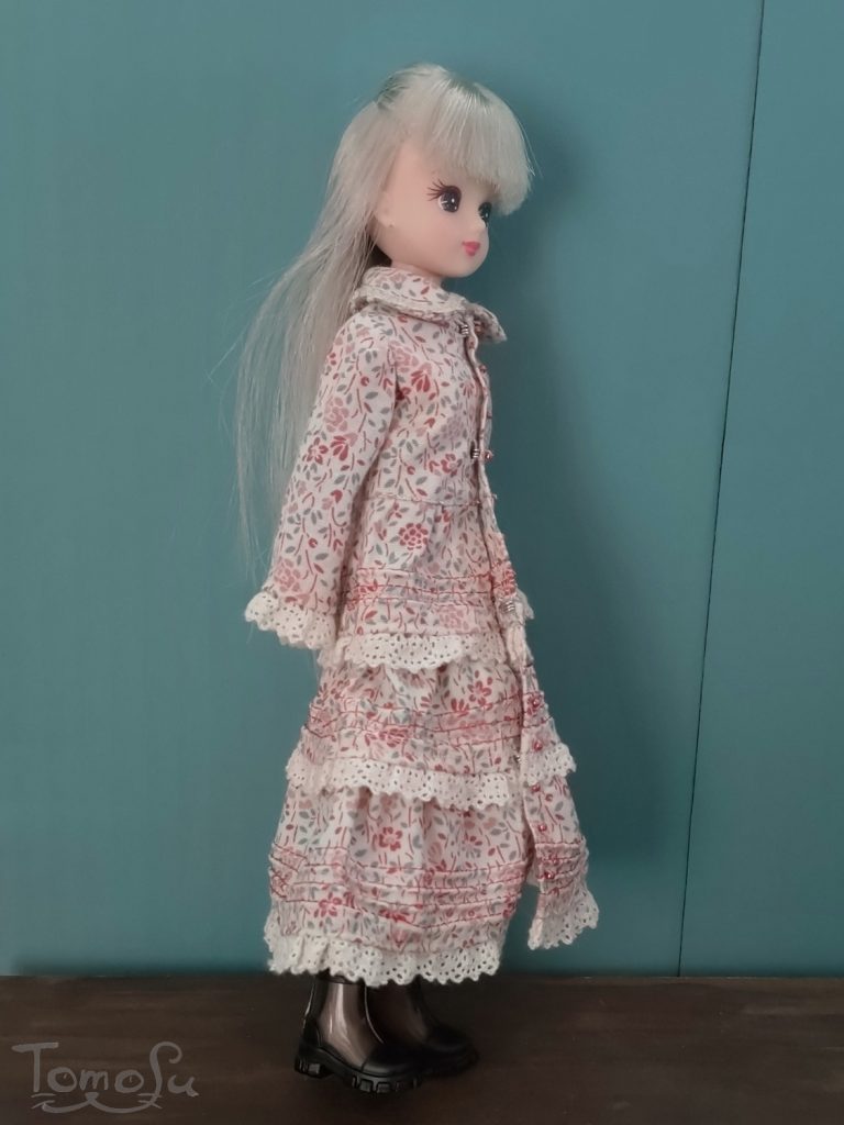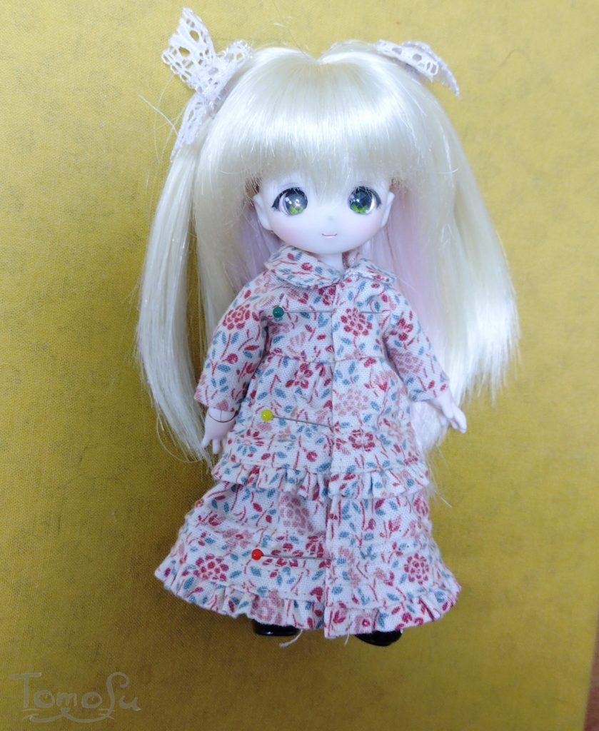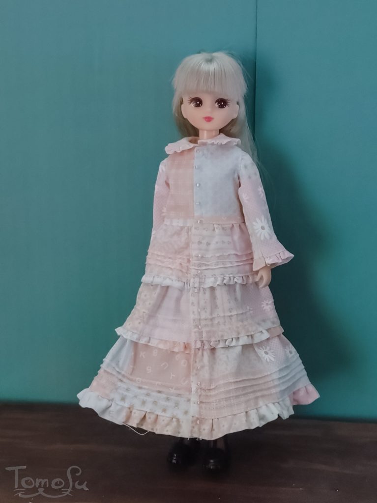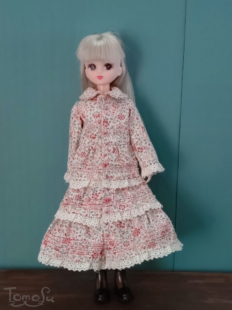 オビツ11くらいのサイズ。こちらはスカートが2段です。こちらは花柄、ピンク系パッチワーク柄、赤系パッチワーク柄の3種類あります。2000円。