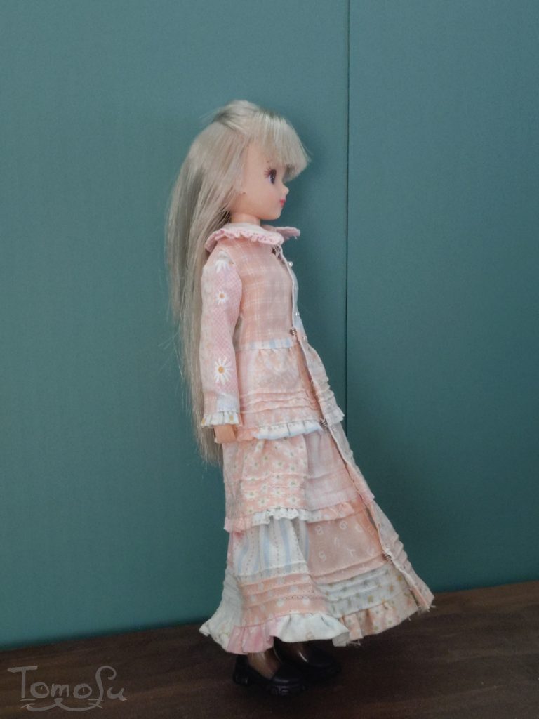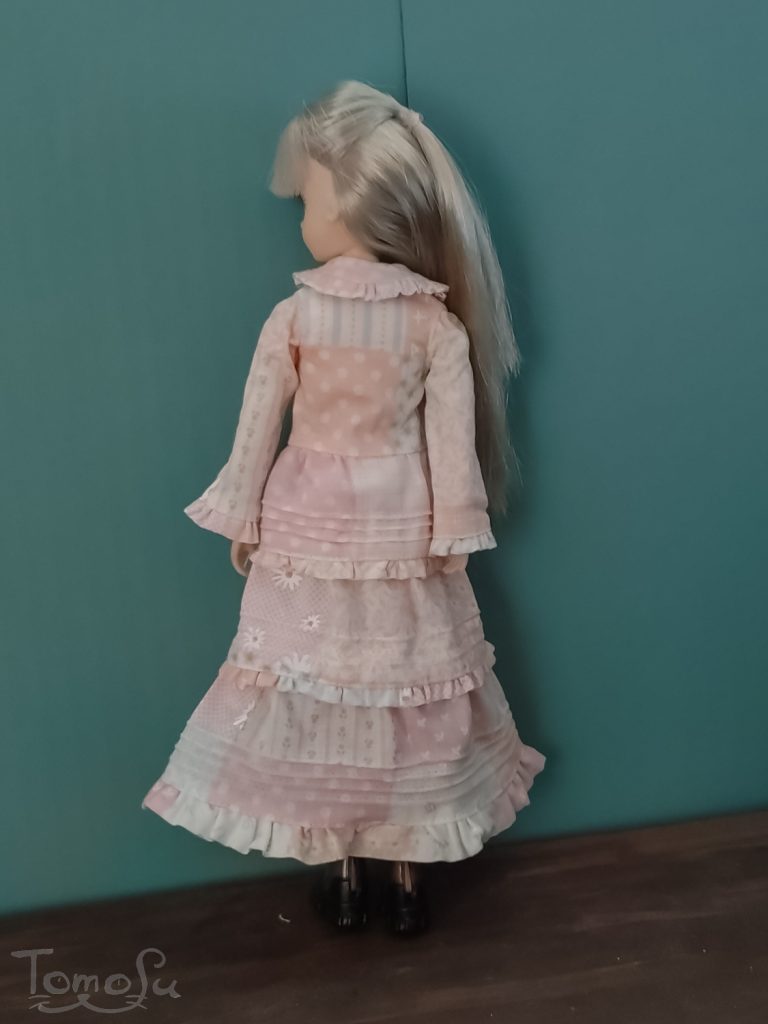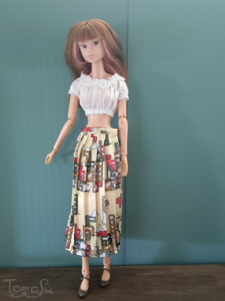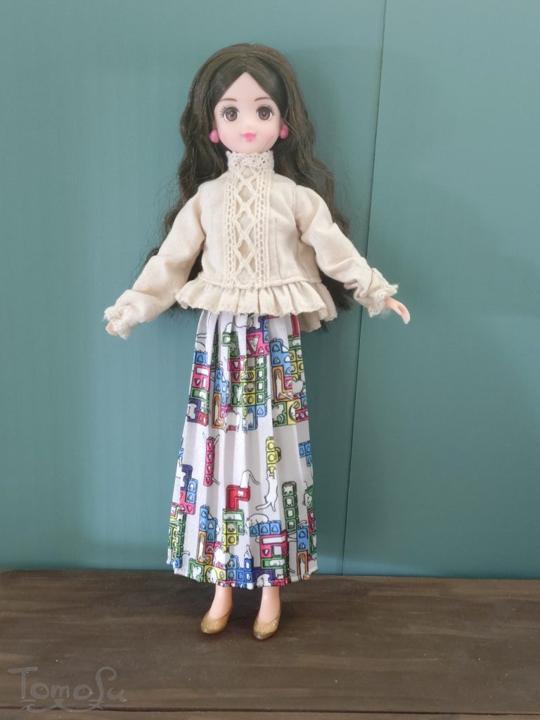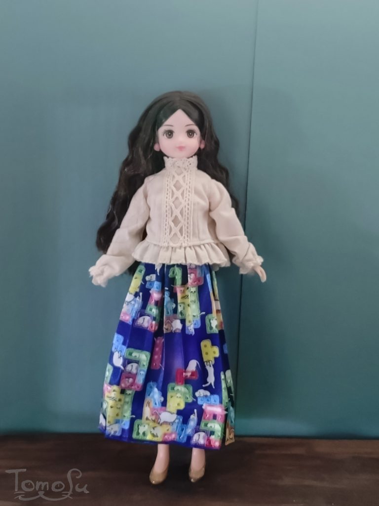 オリジナルのポリエステルサテン生地を使ってスカートを作りました。モデルのみおちゃんは、身長およそ24cm、リカ様より少し背が高いですが結構なロング丈になります。