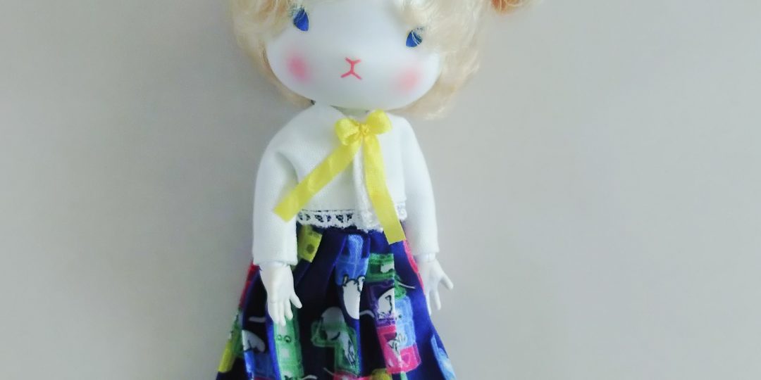 こちらはオビツ11およびピコニーモPサイズのブラウスとスカートのセットです。minneさんにはすでに置いていますがイベントではお初です。セットで1500円。ブラウスにはリボンをつけていますが前後逆に着せて無地にすることもできます(^▽^)/